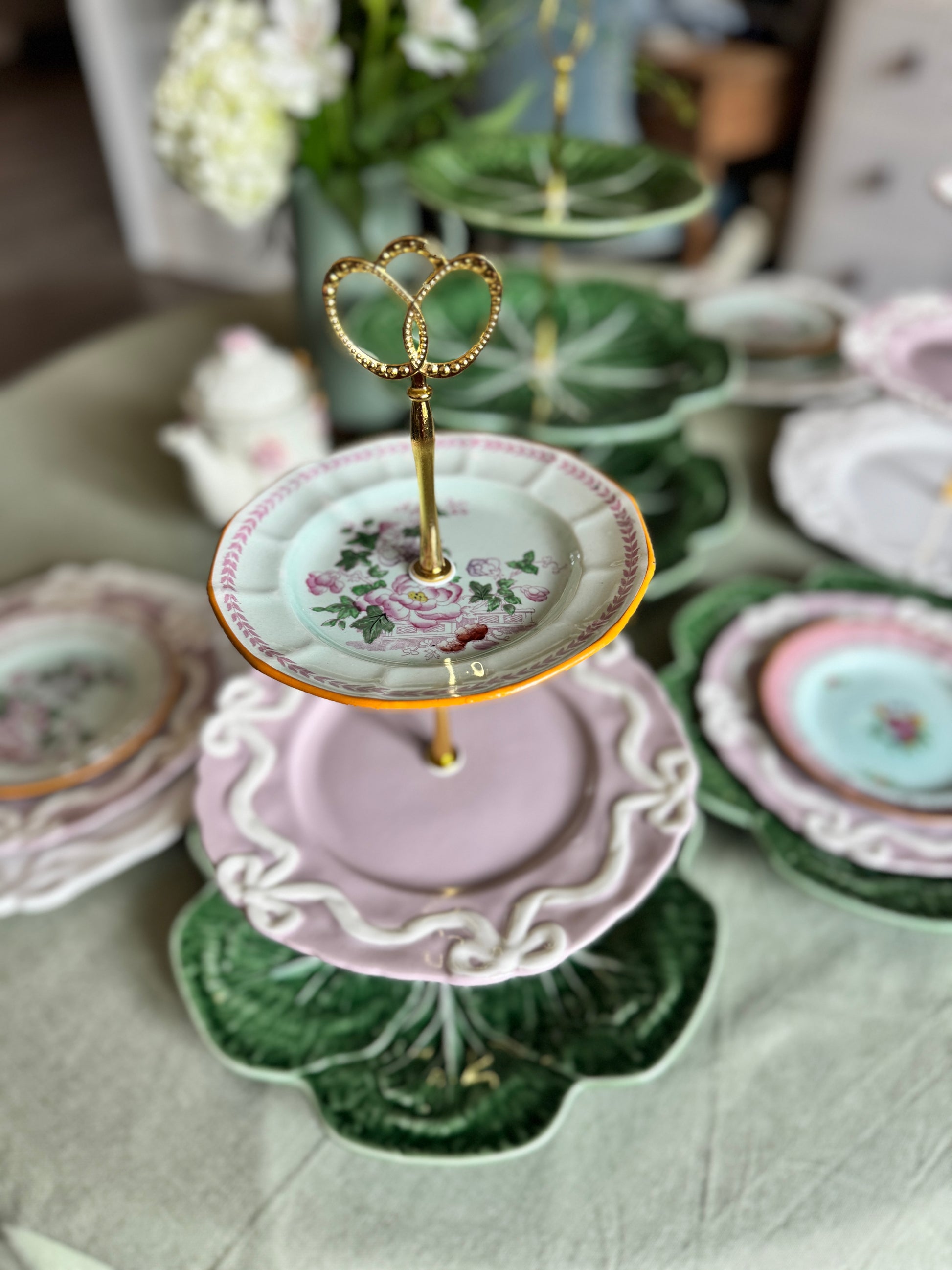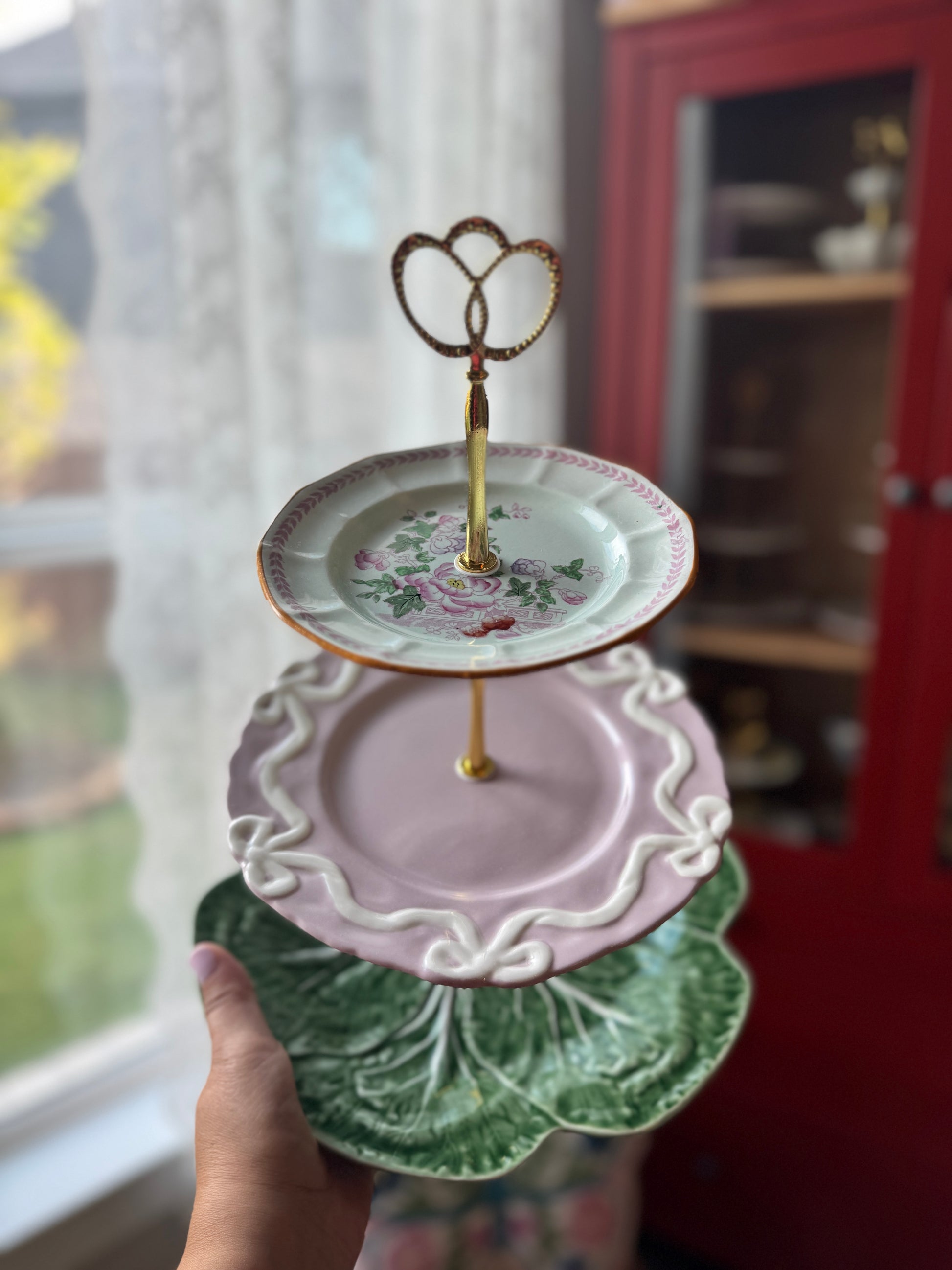 A one-of-a-kind handcrafted tiered stand featuring a vintage Adam’s Calix floral plate on top, a lilac Anthropologie Benedita Bow plate in the middle, and the iconic Bordallo Pinheiro cabbage plate as the base. This unique mix of history and modern design makes a stunning centerpiece for tea parties, dessert displays, or elegant entertaining. Ideal for collectors of vintage china and lovers of designer tableware.