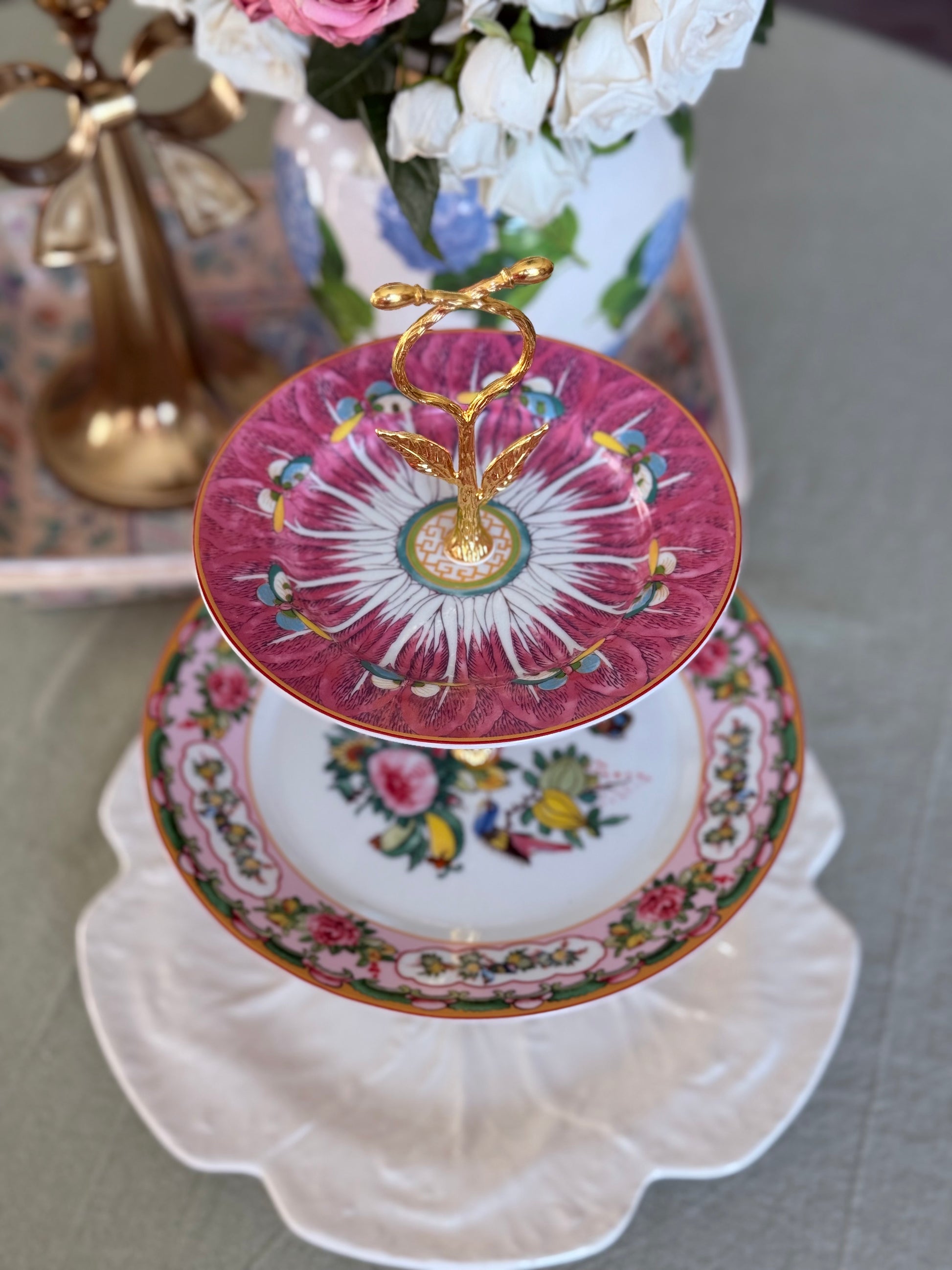 This exquisite three-tier stand combines timeless charm with heirloom craftsmanship. Featuring a 12.5-inch beige Bordallo Pinheiro cabbage base, a vintage floral middle plate, and a vibrant pink top plate, it’s a one-of-a-kind piece designed for the modern hostess who loves tradition.