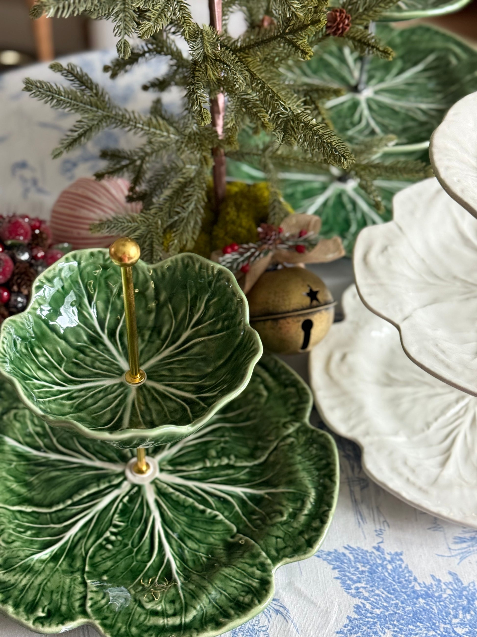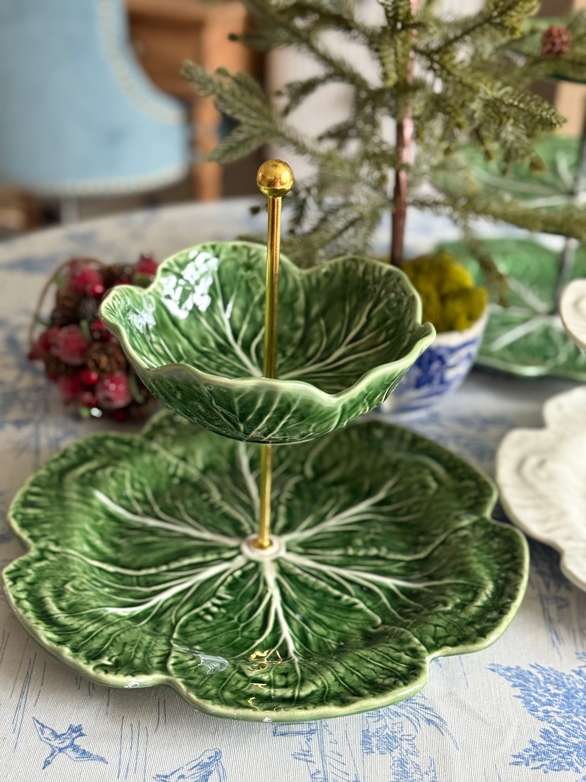 Elevate your hosting with this handcrafted Bordallo Pinheiro cabbageware tiered stand, created using a 12-inch Bordallo charger paired with a matching cabbage bowl top. Each piece is carefully assembled by hand to create a functional, heirloom-quality serving stand that adds character to your kitchen, table, or holiday display.