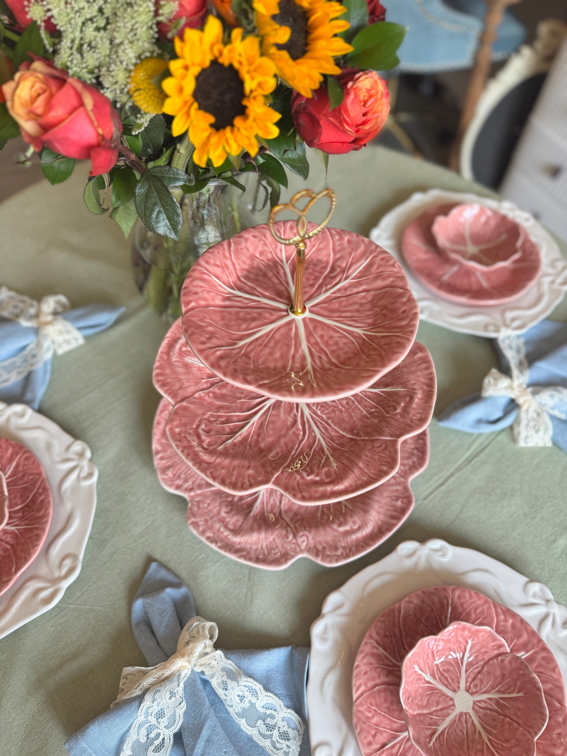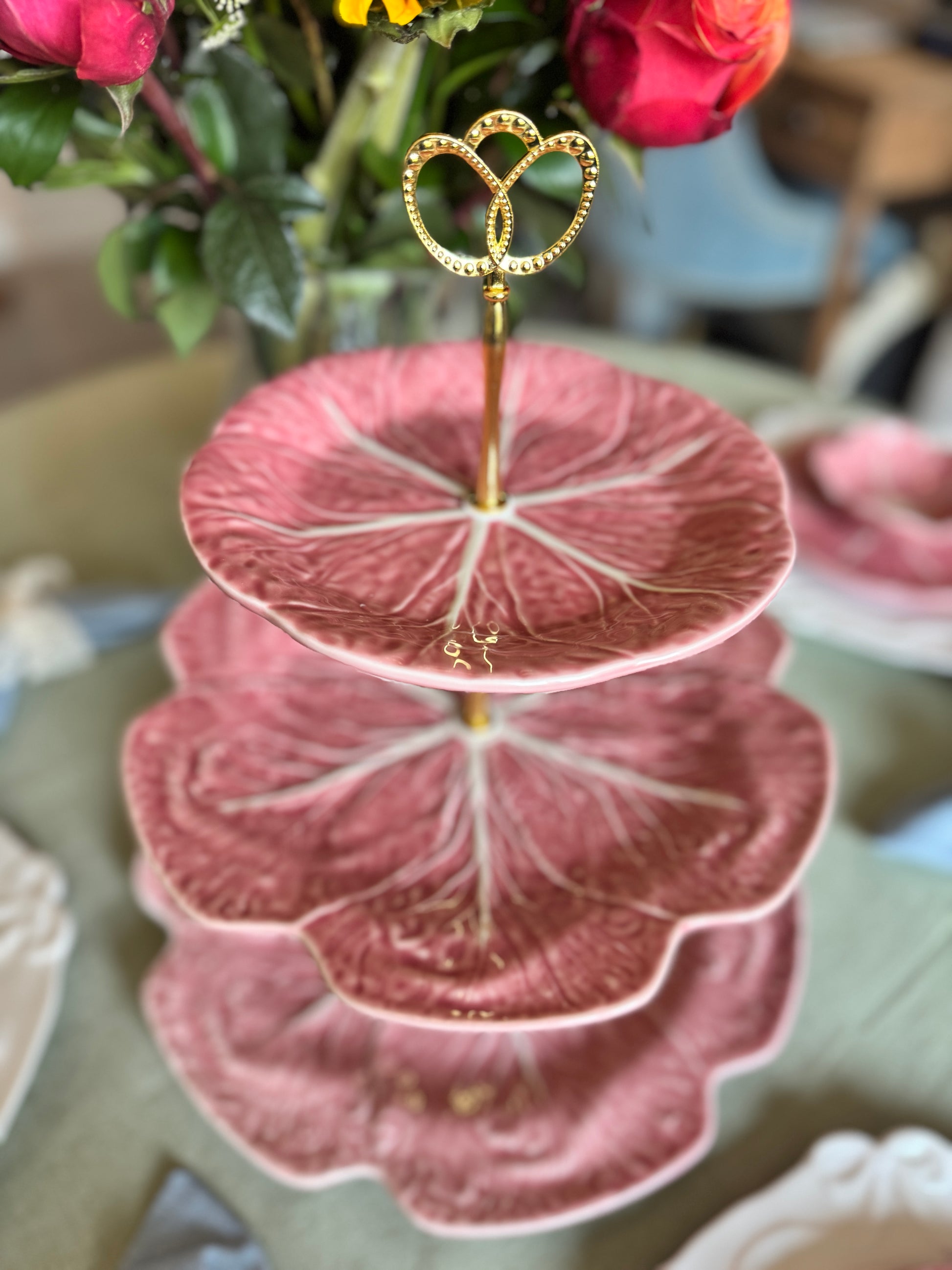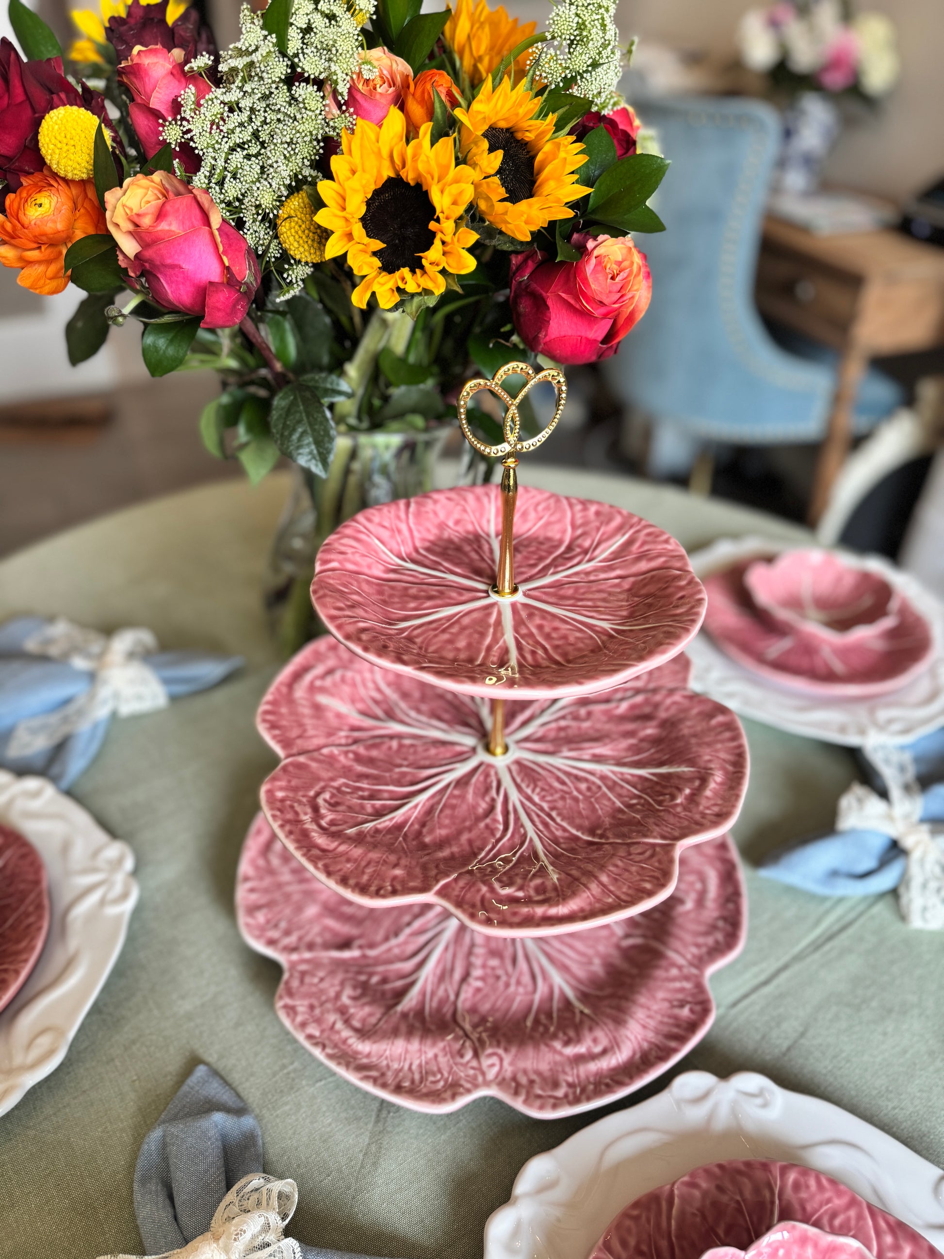 Bring timeless elegance to your table with this handcrafted Bordallo Pinheiro Pink Cabbage 3-Tier Stand. Made exclusively with all-new plates, this statement piece features a sturdy 12-inch charger base, layered with beautifully detailed pink cabbage leaf plates. Perfect for serving desserts, tea sandwiches, fruit, or as a centerpiece for parties, weddings, and holiday gatherings. A collectible piece for Bordallo lovers and an unforgettable gift for the hostess who has everything.
