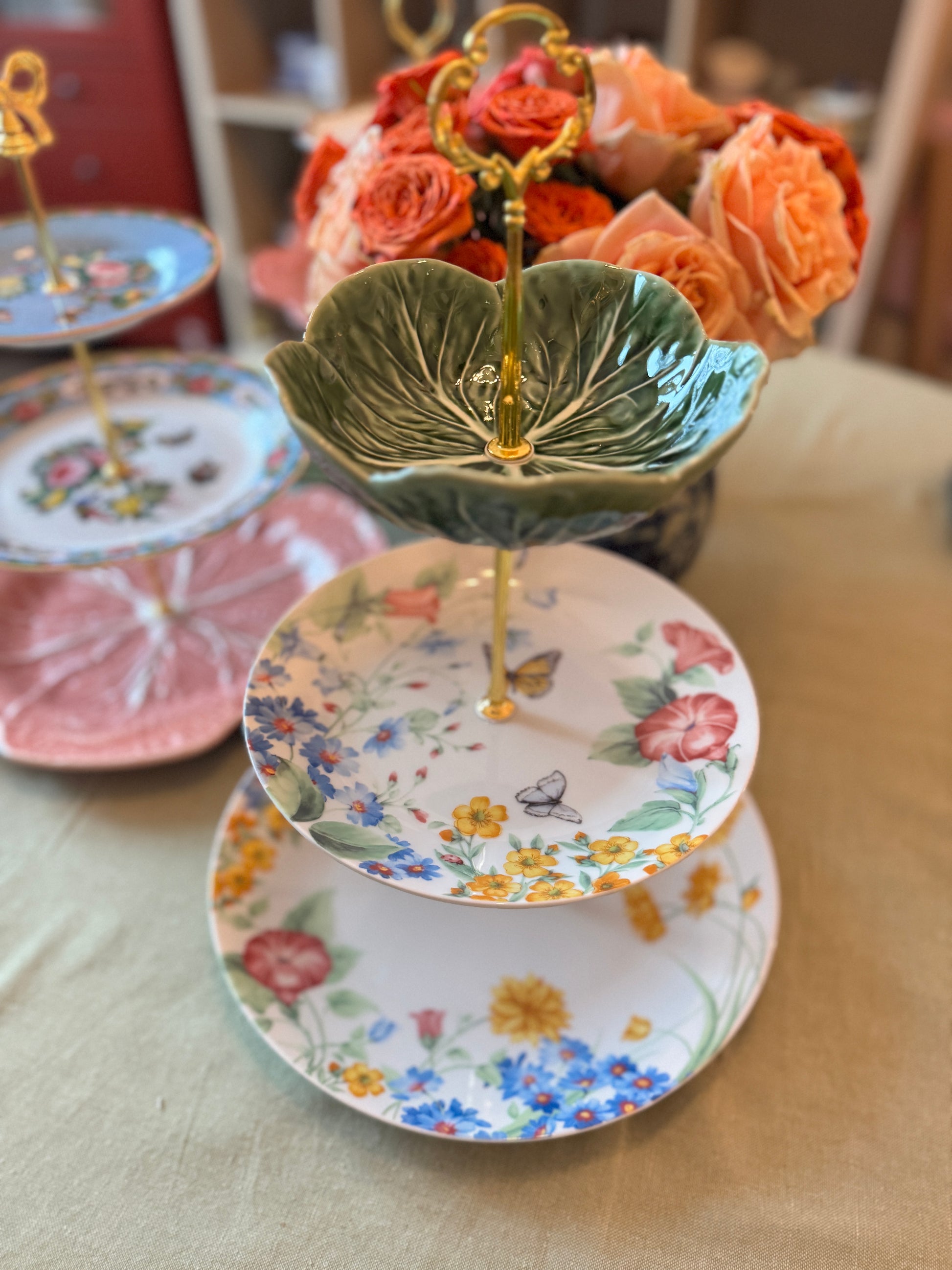 Bring timeless charm to your gatherings with this handcrafted three-tier stand made from Pfaltzgraff Anabelle floral plates and a Bordallo Pinheiro cabbage bowl. The delicate Anabelle pattern, with its butterflies and wildflowers, beautifully complements the iconic cabbage leaf design, creating a piece that’s both functional and heirloom-worthy.
