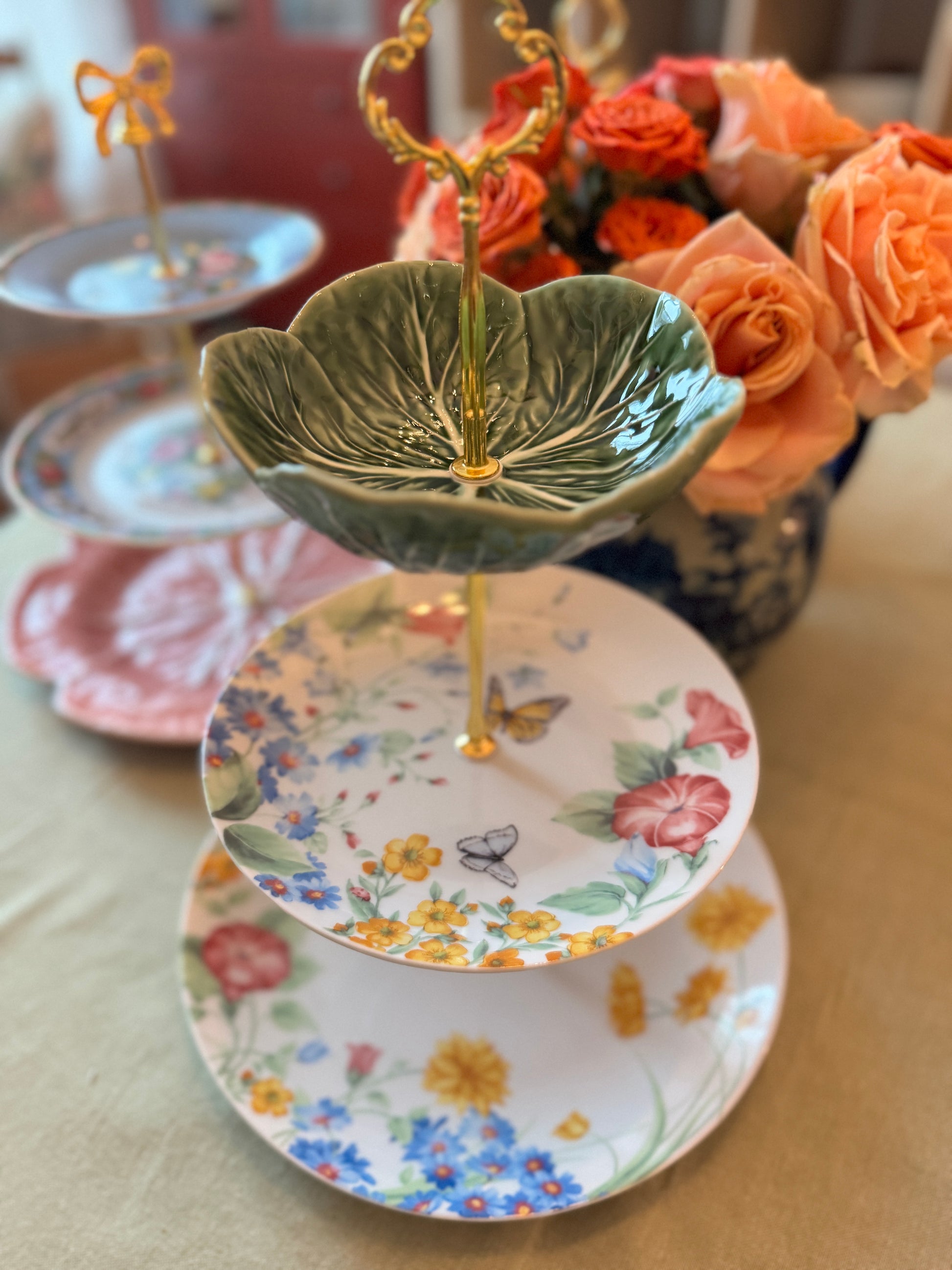 Handcrafted Pfaltzgraff Anabelle Floral & Bordallo Cabbage Tiered Stand – 3-Tier Dessert and Serving Tray
