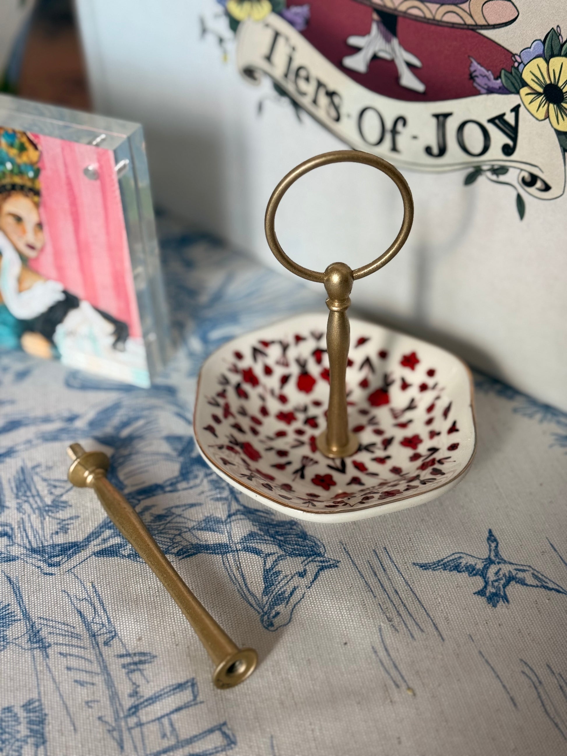 This exclusive brushed gold hardware set features a circle finial and coordinating rod designed specifically for tiered stands.