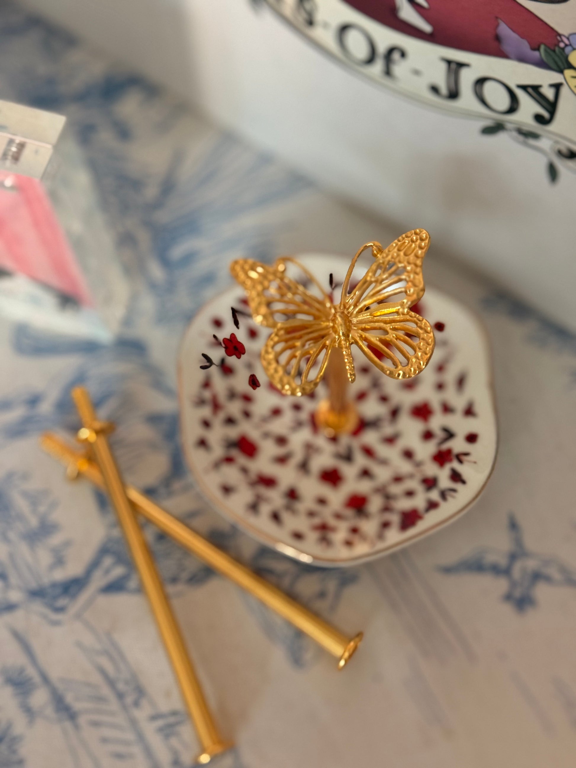 Crafted with a warm gold finish and graceful butterfly detail, this piece adds a whimsical yet timeless accent that pairs effortlessly with floral china, vintage patterns, and modern mixes alike. It’s the same hardware we use in many of our custom Tiers of Joy creations.