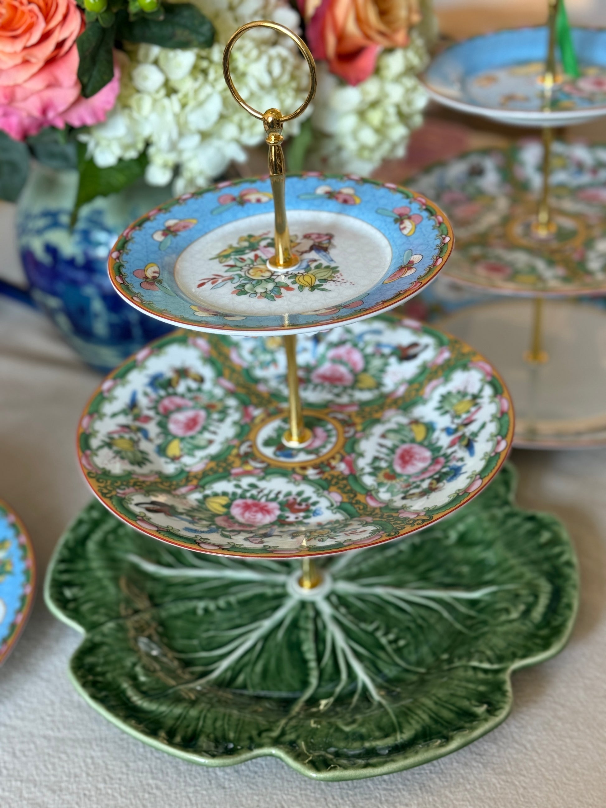 Williams Sonoma Famille Rose and Bordallo Green Cabbage Three Tiered Stand (12” base plate)